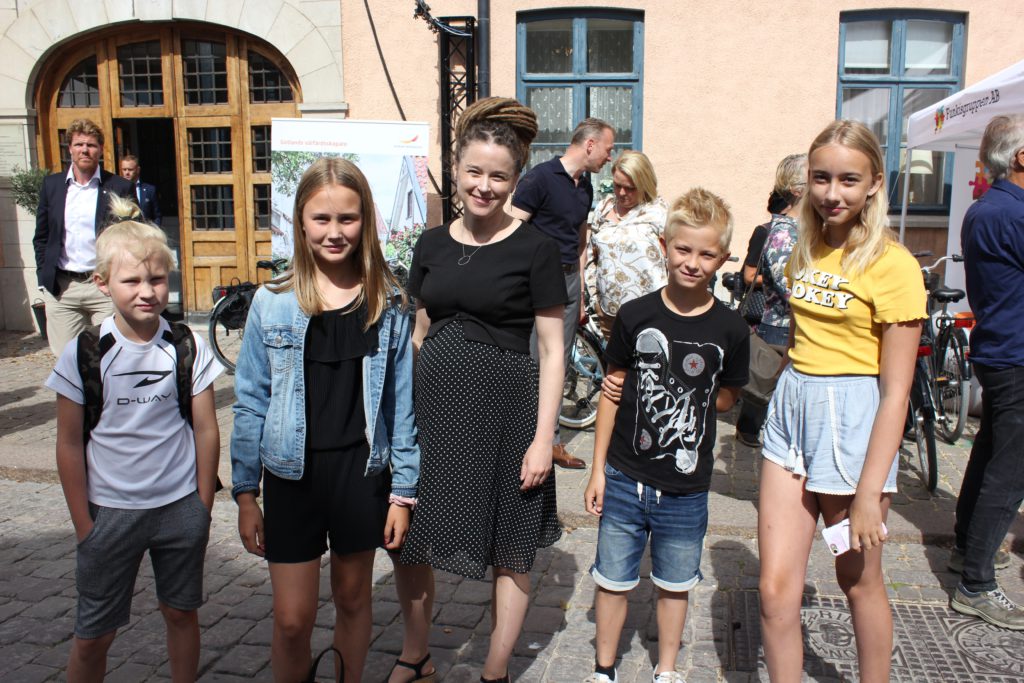 Från vänster: Elimar, Wilma, kultur- och demokratiminister Amanda Lind, Lucas och Livia. Bild: Celia Boltes