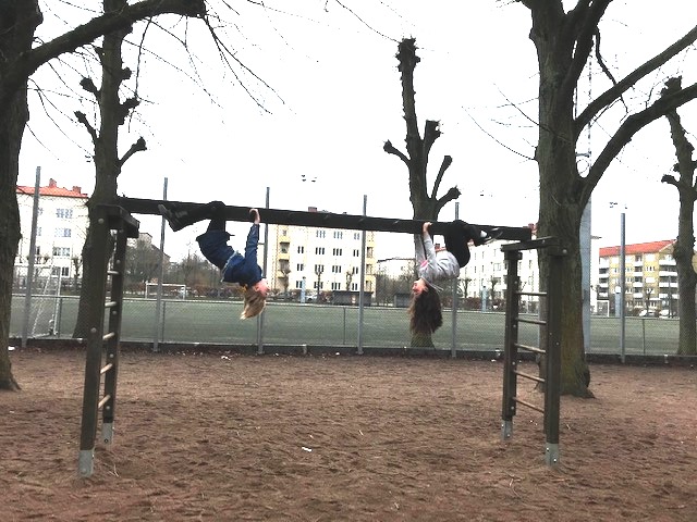 På rasten brukar Tora och Aysu klättra på klätterställningen och hänga i knäveck.
