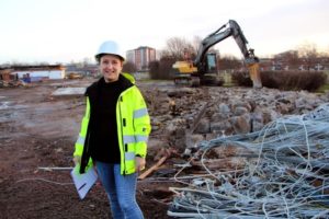 Kommunens projektledare för nya Fredricelund, Camilla Jansson, vid rivningen av gamla Fredricelundsskolan som pågår för fullt. Foto: Christer Wik